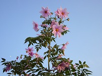 背の高いきれいな皇帝ダリアとイルミネーションが温かく迎えてくれる。 |