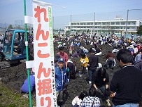 親子どろんこ「れんこん掘り大会」に500名